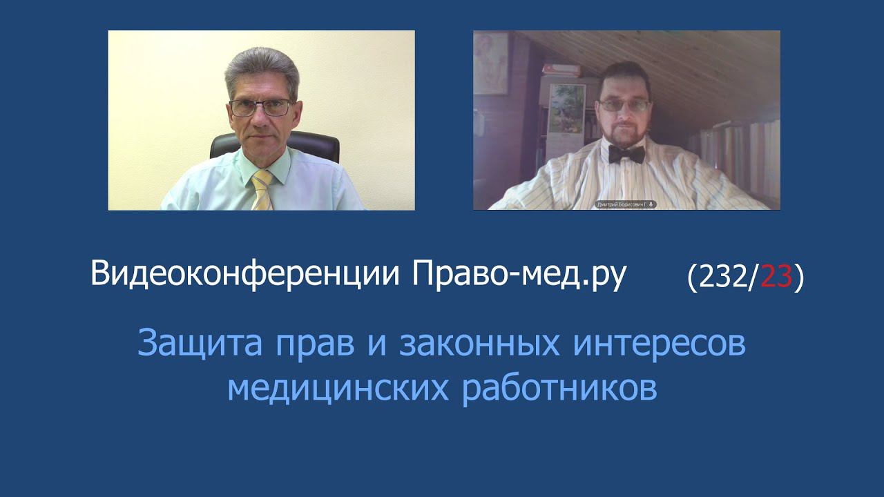 Видеоконференция Право-мед.ру № 232 (23) от 3 октября 2023 года, на которой обсуждался предложение ЛДПР по учреждению института Уполномоченного по правам врачей Рассмотренный вопрос 1. Институт медицинского омбудсмена: необходимость введения, прогноз влияния на обеспечение гарантий соблюдения прав и законных интересов медицинских работников Тайминг Панов А.В., вступление 01:01-04:42 Гаганов Д.Б. 04:59-11:46 Панов А.В. 11:48-15:01 Участники: Панов Алексей Валентинович, главный редактор информационного портала Право-мед.ру, г. Омск , член АЮР Гаганов Дмитрий Борисович, юрисконсульт Ассоциации организаторов здравоохранения в онкологии г. Санкт-Петербург