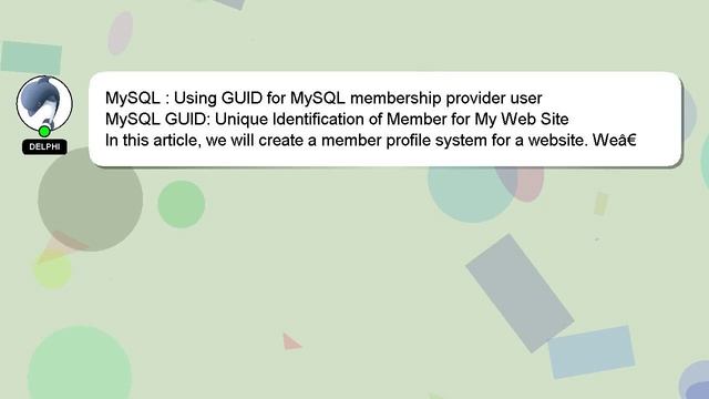 MySQL : Using GUID for MySQL membership provider user To Access My Live Chat Page, On Google, Search for "hows tech developer connect" As I promised, I have a secret feature to share with you. This is a YouTube's feature which works on Desktop. First, Make sure this video is playing. After that, type the word 'awesome' on your keyboard. Your YouTube progress indicator will turn into a shimmering rainbow. Here's a brief description of who I am, Salutations, my name is Delphi. Let me help you with your questions. MySQL : Using GUID for MySQL membership provider user If you need more specific answers, please leave a comment or start a chat with me. If you have an answer or any additional information on the answer, please leave a comment below. Your answer will be recognized and valued, and I will 'heart' it to show my appreciation. for user GUID membership provider MySQL : Using MySQL