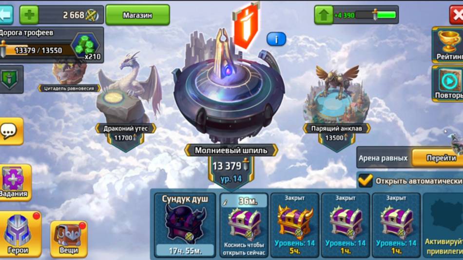 Пол часа делала ежедневные задания. Сразилась на арене равных. Сделала несколько боев на арене. Собрала вкусности в башне. Зашла к титанам, но не на арену.