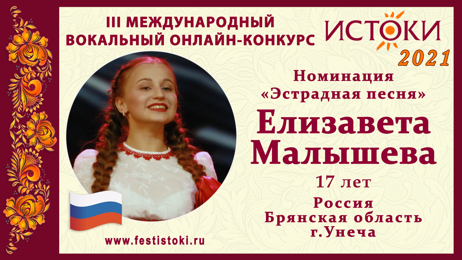 Лауреат I степени III Международного вокального онлайн-конкурса «Истоки». Номинация "Эстрадная песня". Песня "Хава Нагила". Слова Авраам Цви Идельсон, музыка Соше Натансон. Сайт: www.festistoki.ru / www.festistoki.com E-mail: festistoki@mail.ru