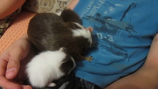 Морские свинки трещат и пищат сидя на коленях Guinea pigs eat cabbage cucumber carrot.mp4