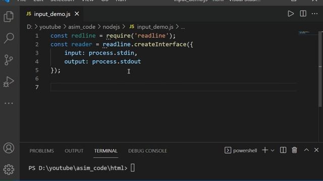 In this video, we will learn How To Get Input from the Terminal in Node.js . Please Subscribe to Asim Code. Code: https://github.com/asimcode2050/Asim-Code-Youtube-Channel-Code/blob/main/Node.js/input_demo.js