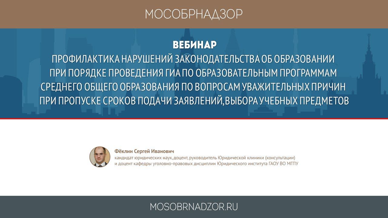 Вебинар «Профилактика нарушений законодательства об образовании при порядке проведения ГИА по образовательным программам среднего общего образования по вопросам уважительных причин при пропуске сроков подачи заявлений, выбора учебных предметов» был проведен в рамках проекта Мособрнадзор.РФ 8 июня 2017 года. Ведущий вебинара - Феклин С.И. Страница вебинара на сайте проекта - http://mosobrnadzor.ru/supervision/webinars/2017-06-08_10-00