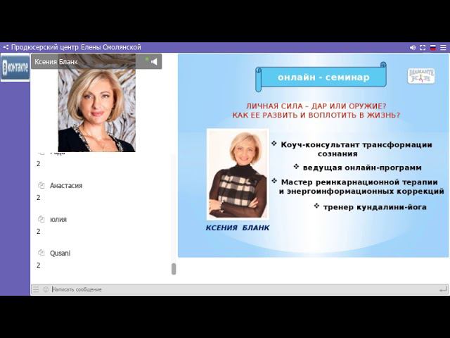 Индивидуальная коуч-сессия https://lenasmol.autoweboffice.ru/?r=ordering/cart/as1&id=865&clean=true&lg=ru Курс https://sites.google.com/view/kblank/ Подробности оформления заказа здесь https://goo.gl/VWixks #ксениябанк #квадратпифагора #психоматрица #предназначение #тест #личнаясила ******************** Контакты: Skype: mamalenasm Электронная почта: es101@list.ru