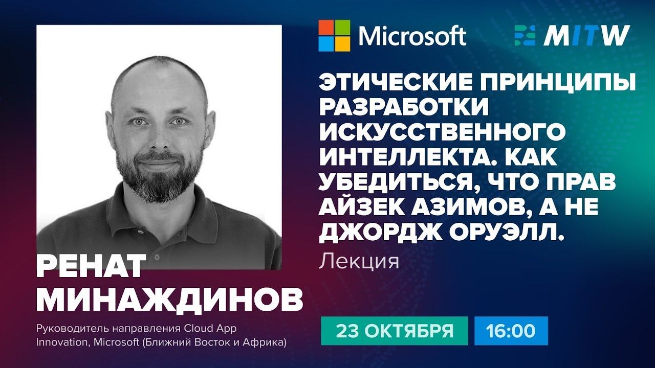 Выпускник МИЭТ 2005 года - Ренат Минаждиноа (факультет МПиТК) –руководитель направления Cloud App Innovation в Microsoft (Ближний Восток и Африка). Тема лекции: перспективы развития искусственного интеллекта, практические примеры и принципы, с которыми на базе своей и мировой практики сегодня работает компания Microsoft.