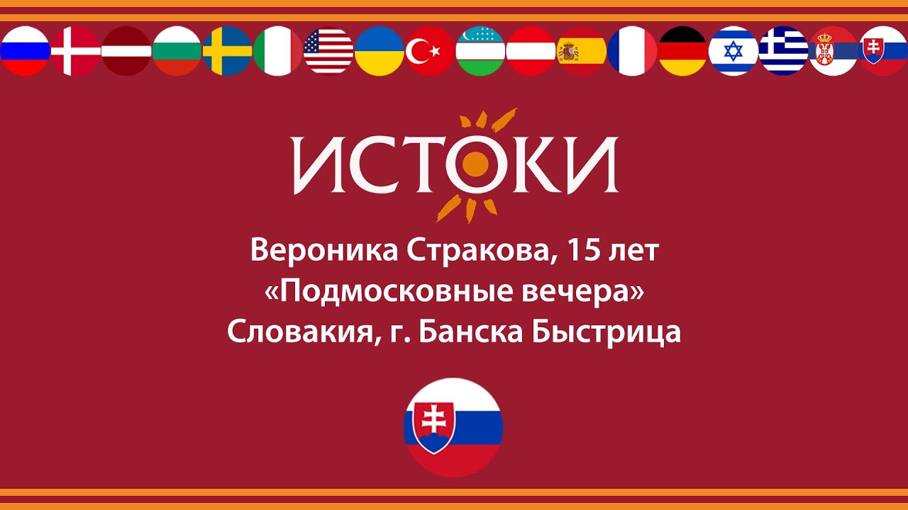 Вероника Стракова, 15 лет - старшая возрастная группа Словакия, г.Банска Быстрица Песня «Подмосковные вечера» Вероника представляет Общественную организацию «Россия». Фестиваль-конкурс русской культуры «Истоки» ставит своей задачей показать многообразие и красоту русской культуры, которая на протяжении многих веков формировалась за счет традиций многонациональности и добрососедства. Фестиваль-конкурс русской культуры «Истоки» - многоплановое мероприятие, которое объединяет конкурс вокалистов, обширную экскурсионную и культурную программу, концертные выступления, гала-концерт и награждение участников фестиваля-конкурса. Мы расширяем русскоязычное пространство. Благодаря поддержке Россотрудничества в фестивале принимают участие дети-соотечественники, проживающие за рубежом. Сайт: www.festistoki.ru E-mail: festistoki@mail.ru
