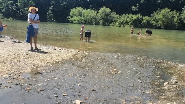 Ребёнок готов и в луже искупаться, но горная речка холодная и дно каменистое.
