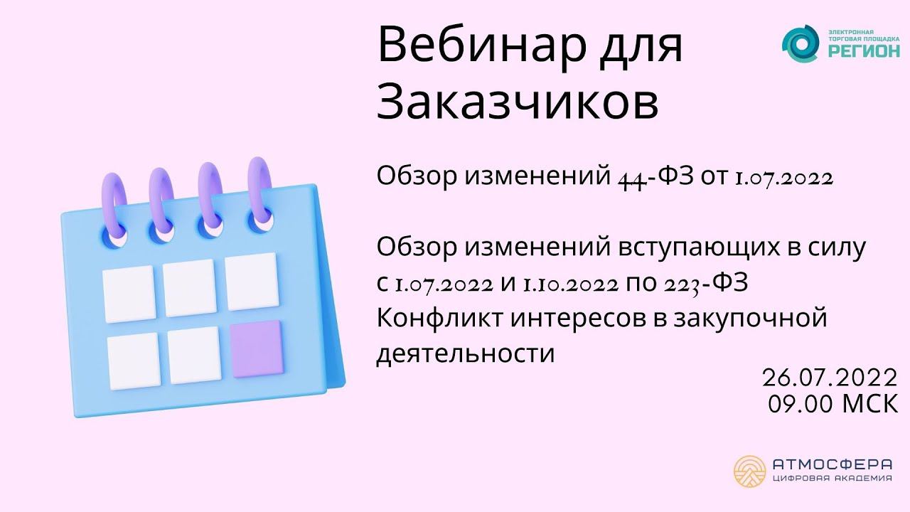 Подписывайтесь на нас в социальных сетях, чтобы не пропустить свежие новости: https://academy-atmosphere.ru/zakupki https://t.me/academy_atmosfera https://vk.com/academy_atmosfera https://rutube.ru/channel/24606397/ 00:00 Вступление 01:55 Приветствие спикера Султанову Лилию Файласовну 02:14 ОБЗОР ИЗМЕНЕНИЙ ПО 44-ФЗ от 01.07.2022 02:36 Сроки оплаты по контрактам с июля 2022 года 04:55 Новое требование к участнику закупки 06:45 Скорректированы требования к контрактной службе, контрактному управляющему и комиссии по закупкам 11:13 Уточнены требования к содержанию независимой гарантии 16:14 Претензионная работа 20:20 Упрощен процедура одностороннего отказа заказчика от исполнения контракта, заключенного по результатам электронных процедур, закрытых электронных процедур 24:31 Новый порядок одностороннего отказа поставщика от исполнения контракта, заключенного по результатам электронных процедур 29:00 Сроки направления обращения о включении участника закупки в РНП 31:00 Новый порядок заключения контракта с участником электронной закупки при расторжении контракта с победителем такой закупки 35:39 Алгоритм заключения контракта с участником электронной закупки при расторжении контракта с победителем такой закупки 43:19 Изменения по электронному актированию и типичные ошибки со стороны заказчика 59:47 Основание для изменения по соглашению сторон существенных условий контракта на поставку лекарственных препаратов, медицинских изделий, расходных материалов 01:01:25 Закупки, предусмотренные пп. 5.1 и 5.2 ч. 1 ст. 93 Закона N 44-ФЗ 01:21:06 Анонс вебинаров на август 01:23:15 Приветствие спикера Губайдуллину Асылъяр Ильдусовну 01:23:28 Обзор изменений вступающих в силу с 1.07.2022 и 1.10.2022 по 223 ФЗ (Конфликт интересов в закупочной деятельности) 01:24:03 Изменения 223 ФЗ c апреля 2022 01:24:13 Сокращение сроков оплаты по договорам 01:25:00 Изменения сроков оплат 01:25:27 Сокращение сроков оплаты по договорам 01:28:59 Вопрос от спикера 01:29:38 Описание закупки 01:30:35 Описание закупки (статья 6.1 223 ФЗ) 01:30:51 Изменения в строительных закупках 01:33:15 Изменения в независимых гарантиях 01:35:41 Регламентирован порядок проведения закупок у СМП по принципу «электронного магазина» 01:36:15 Изменения в планах закупок 01:37:46 Изменения в основаниях для включения в РНП 01:38:26 Изменения в РНП 01:38:28 Коррекция состава извещения 01:38:48 Конфликт интересов в закупочной деятельности у заказчиков по 223 ФЗ 01:39:58 Конфликт интересов 01:47:19 ФЗ от 25.12.2008 N 273-ФЗ "О противодействии коррупции" 01:48:06 Письмо Минтруда России от 30.09.2020 N 18-2/10/П-9716 01:49:50 Мнение Минфина 01:50:29 "Стандарт осуществления закупочной деятельности отдельных видов юридических лиц" (утв. ФАС России) 01:53:18 Пример отражения в ПоЗ 01:54:43 Антикоррупционная оговорка в типовых договорах/контрактах 01:55:22 Изменения в ПоЗ 01:56:23 Административная практика по теме конфликта интересов у заказчиков по 223 ФЗ 01:57:26 Решение №014/07/3-394/2022 Якутского УФАС России от 8 апреля 01:58:27 Решение №038/8/20 Иркутского УФАС России от 10 января 2020 года 2022 года 01:59:01 Судебная практика по теме конфликта интересов у заказчиков по 223 ФЗ 01:59:17 Постановление Девятого арбитражного апелляционного суда от 12.08.2021 N 09АП-42681/2021-ГК по делу N А40-214684/2020 01:59:52 Постановление Арбитражного суда Поволжского округа от 18.12.2019 N Ф06-55902/2019; Постановление Восточно-Сибирского округа от 29.08.2019 N Ф02-4025/2019 02:00:24 Определение Верховного Суда РФ от 17.04.2020 N 306-ЭС20-3860 по делу N А55-13594/2019 02:01:24 Вопросы от спикера