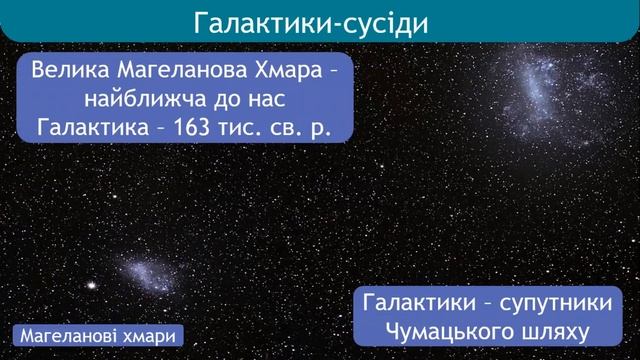 СВІТ ГАЛАКТИК. АКТИВНІ ЯДРА ГАЛАКТИК ФОРМУВАННЯ КОМПЕТЕНТНОСТЕЙ: Предметна компетентність: розглянути класифікацію галактик за Габблом (еліптичні, лін-зоподібні, спіральні, неправильні, взаємодіючі, карликові), ознайомити з космічним явищем акти-вності ядер галактик, міжгалактичним середовищем, міжгалактичними відстанями, системами галактик: групами, скупченнями і надскупченнями галактик, законом розширення Всесвіту (закон Габбла), масштабною моделлю нашого Всесвіту; Ключові компетентності: Спілкування державною мовою - спілкуватися за проблематикою предмету сучасною науко-вою мовою з використанням усталених астрономічних термінів та понять; чітко та однозначно формулювати судження та аргументувати їх; налагоджувати комунікації у процесі вирішення на-вчальних завдань та виконання проектів; чітко та стисло викладати основний астрономічний зміст питань у письмовій формі; цінувати наукову українську мову; готувати та представляти по-відомлення, доповіді та реферати, презентувати результати проектної діяльності. Спілкування іноземними мовами - оперувати найбільш вживаними в міжнародній практиці астрономічними термінами; користуватися іншомовними джерелами як додатковими під час виконання навчальних завдань та проектів; Математична компетентність застосовувати математичний апарат і закони фізики для обґру-нтування та доведення тверджень; опрацювання, інтерпретації, оцінювання результатів спостере-жень; моделювання астрономічних явищ у формі математичних рівнянь і співвідношень; Основні компетентності у природничих науках і технологіях: характеризувати роль астро-номічних знань у формуванні природничо-наукової картини світу; усвідомлювати значення астро-номії для дослідження довкілля; Інформаційно-цифрова компетентність: використовувати інформаційні системи для швидко-го та цілеспрямованого пошуку інформації; користуватися сучасними гаджетами як інструмента-льними засобами; визначати можливі джерела інформації, добирати потрібну інформацію, оціню-вати, аналізувати, перекодовувати інформацію; працювати з програмами-симуляторами астрономі-чних явищ; Уміння вчитися впродовж життя: планувати самостійне опрацювання навчального матеріалу з астрономії; визначати цілі навчальної діяльності в короткотерміновому та довготерміновому періодах; виконувати самостійний пошук інформації з використанням різних видів джерел; виділяти головне в опрацьовуваній інформації; критично оцінювати власні досягнення; усвідомлювати важливість самоосвіти для успішного життя. Ініціативність і підприємливість: ухвалювати рішення щодо вибору найоптимальніших аль-тернатив під час вирішення навчальних завдань з астрономії; пропонувати способи та засоби еко-номії енергетичних, часових, фізичних ресурсів у навчальному процесі та побуті, співвідносити очікувані результати та ресурси, потрібні для їх досягнення; усвідомлювати досяжність поставле-них цілей як результату наполегливої праці. Соціальна та громадянська компетентності: відстоювати аргументовано свої погляди на ви-рішення навчальних завдань та сприймати аргументовані пропозицій товаришів; дотримуватися принципів демократичності та відповідальності під час роботи в групі; пропонувати шляхи під-вищення рівня соціального розвитку на основі сучас