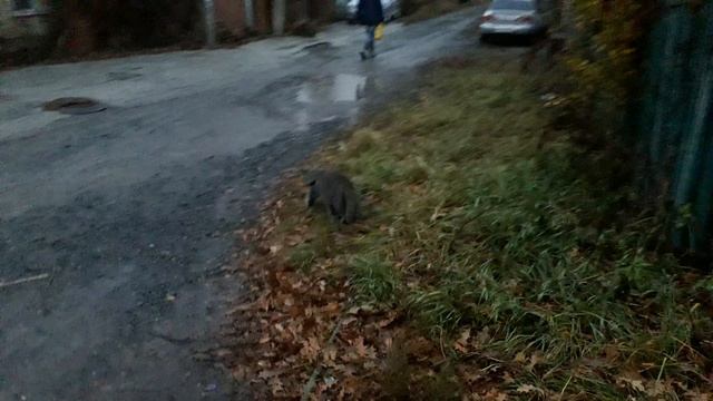 Гуляет котие, пасмурно и сыро но котика это не пугает.