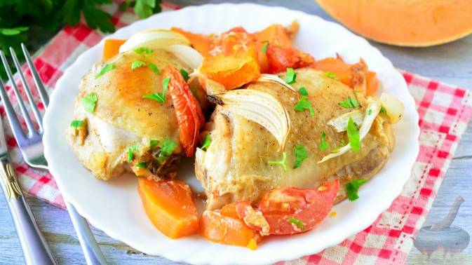 И гарнира не нужно. КУРИНЫЕ БЁДРЫШКИ, ЗАПЕЧЁННЫЕ С ТЫКВОЙ И ПОМИДОРАМИ