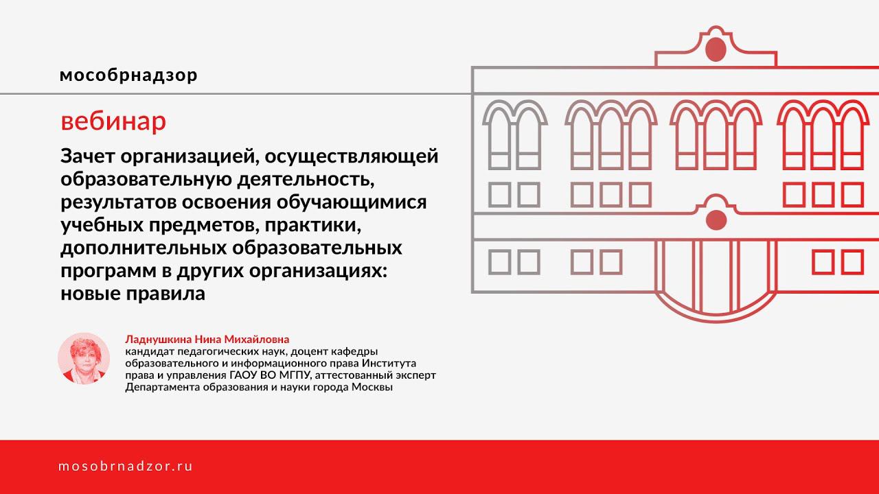 Вебинар «Зачет организацией, осуществляющей образовательную деятельность, результатов освоения обучающимися учебных предметов, практики, дополнительных образовательных программ в других организациях: новые правила» был проведен в рамках проекта Мособрнадзор.РФ 21 сентября 2020 года. Ведущая вебинара - Ладнушкина Н.М. Страница вебинара на сайте проекта - http://mosobrnadzor.ru/prevention/webinars/2020-09-21_16-00
