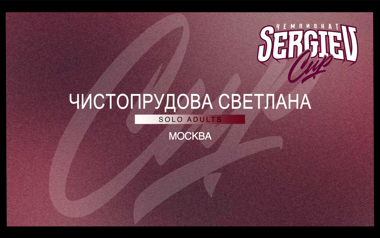 SERGIEV CUP 2024 Чистопрудова Светлана Номинация: Solo Категория: Adults Жюри чемпионата: Тоха Андреев Артем Соляник Артем Нефедов ОРГАНИЗАТОР МЕРОПРИЯТИЯ: TRIASH PRODUCTION Информация о предстоящих чемпионатах: Telegram : https://t.me/triash_prod ВК : https://vk.com/sergiev_cup YOUTUBE : https://www.youtube.com/channel/UCPDX3Znh7OJQqmb0v5u1MHw Дополнительная информация : +7 (916) 533-50-63