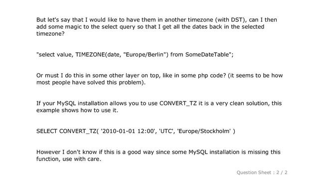 MySQL : Can MySQL convert a stored UTC time to local timezone? [ Beautify Your Computer : https://www.hows.tech/p/recommended.html ] MySQL : Can MySQL convert a stored UTC time to local timezone? Note: The information provided in this video is as it is with no modifications. Thanks to many people who made this project happen. Disclaimer: All information is provided as it is with no warranty of any kind. Content is licensed under CC BY SA 2.5 and CC BY SA 3.0. Question / answer owners are mentioned in the video. Trademarks are property of respective owners and stackexchange. Information credits to stackoverflow, stackexchange network and user contributions. If there any issues, contact us on - htfyc dot hows dot tech #MySQL:CanMySQLconvertastoredUTCtimetolocaltimezone? #MySQL #: #Can #MySQL #convert #a #stored #UTC #time #to #local #timezone? Guide : [ MySQL : Can MySQL convert a stored UTC time to local timezone? ]