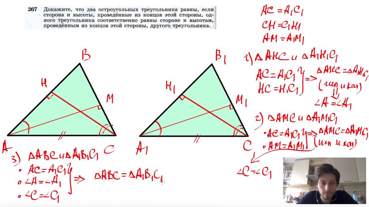 №267. Докажите, что два остроугольных треугольника равны, если сторона и высоты, проведенные из концов этой стороны, одного треугольника соответственно равны стороне и высотам, проведенным из концов этой стороны, другого треугольника. Поддержать канал рублём - 5469400944002125 (Сбербанк) Мой второй канал для подготовки к ЕГЭ и ОГЭ - https://www.youtube.com/ЕвгенийСумин Инстаграм - https://www.instagram.com/EGE_OGE.math Личный инстаграм - https://www.instagram.com/ee_sumin VK - https://vk.com/evgeniysumin FB - https://www.facebook.com/EvgeniySumin