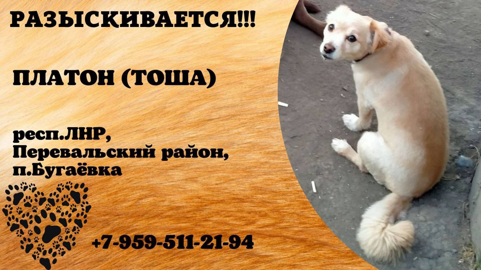 ЛНР Луганск Пропала собака 27.08 Потерялась собака в поселке Бугаёвка (район остановки "Волчье"), зовут Платон. Отзывается также на Тоша. Очень ласковый и дружелюбный. Если кто видел сообщите, пожалуйста. Нашедшему вознаграждение! +79595112194 Анна Инфо: https://vk.com/wall-198815410_151568