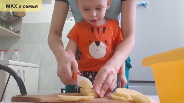 Максим чистит и режет картошку в 1 год 9 мес