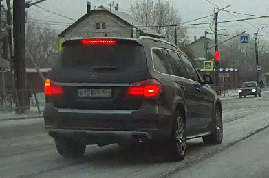 Выезд на перекрёсток на запрещающий движение сигнал светофора, нечитаемый номер. Госномер Е100УР 174 Mersedes-Benz GL-Класс, 2014 г. в., чёрный. Перекрёсток ул. Советской и пер. Советского. 20-12-2021
