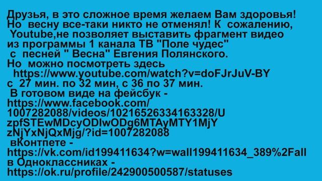 Евгений Полянский. Весна. На первом. Друзья, в это сложное время желаем Вам здоровья! Но весну все-таки никто не отменял! К сожалению, Youtube,не позволяет выставить фрагмент видео из программы 1 канала ТВ "Поле чудес" с песней " Весна" Евгения Полянского.Но можно посмотреть здесь https://www.youtube.com/watch?v=doFJrJuV-BY с 27 мин. по 32 мин, с 36 по 37 мин. В готовом виде на фейсбук - https://www.facebook.com/1007282088/videos/10216526334163328/U zpfSTEwMDcyODIwODg6MTAyMTY1MjYzNjYxNjQxMjg/?id=1007282088 вКонтпете - https://vk.com/id199411634?w=wall199411634_389%2Fall в Одноклассниках - https://ok.ru/profile/242900500587/statuses Поднимаем иммунитет! :) Eugene Polyansky. Spring. On the first chanel.. Friends, hard times now. But no matter what problems arise, no one canceled the spring! Eugene Polyansky. Spring. On the first chanel.. #дни #жизнь #суть #bestsong #город #Москва #bestsong #любитьижить Весна. Зимней стужи край ветер гнал хмельной, Ожидает май доевний гррод мой. Был на крышах снег – талая вода , Не до сна - идет веснаВ Серебро ручьёв и капели звон, Ночью - вой котов растревожат сон, Вновь надеждами эта жизнь полна - Не до сна –идет весна. Так было есть и будет, И знают это люди - Нам этот мир не изменить. За вьюгой и снегами весна не за горами - и смысл есть любить и жить. В лужах площадей небо светится, Детвора спешит в них отметиться, И мамашам их все покоя нег. Не до сна –идет весна. А над храмом крест – золотая высь, Купола небес - сотни солнц зажглись, И спешит народ от света до поздна - Не до сна идет весна. Так было есть и будет, И знают это люди - Нам этот мир не изменить. За вьюгой и снегами весна не за горами - И смысл есть любить и жить. Spring. Winter and wind drove intoxicating, Waiting for May is my old city. There was snow on the roofs now melt water we can not to sleep - spring comes. Silver streams and drips clink, At night - howling cats disturb sleep we have Once again, hopes this life is full - we can not to sleep - spring comes. So it was and will be And people know that - We do not change this world. Behind the blizzard and snow tthe spring will around - and the meaning is to love and live. In the puddle of squares the sky glow, Kids in a hurry to be noted in them, And their moms is near. we can not to sleep - spring comes. And above the temple the cross is a golden heights, The domes of the heavens - hundreds of suns are lit, And the people in a hurry from the light to the night - until sleep comes spring. So it was and will be And people know that - We do not change this world. Behind the blizzard and snow tthe spring will around And the meaning is to love and live.
