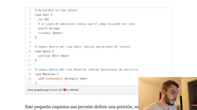 A grandes rasgos GraphQL se compone de tres partes fundamentales: schema, resolvers y clients. Schema o esquema se trata de usar el lenguaje de GraphQL para definir las operaciones con parámetros y valores de retorno. Los resolvers se tratan de la implementación de las operaciones en el esquema, ósea se trata de resolver el resultado de la operación. Esta parte se hace fuera del lenguaje GraphQL por ejemplo con JavaScript. Por último, los clients o clientes se tratan de los consumidores de GraphQL. Consumir GraphQL consiste de escribir una petición en el lenguaje GraphQL pero implementado en algún lenguaje de programación, por ejemplo con JavaScript. Algo así como escribir peticiones de SQL en JavaScript. ======================================= Documentacion GraphQL https://graphql.org/learn/schema/#type-system Mis articulos sobre GraphQL https://medium.com/@leomedina.dev/introducci%C3%B3n-a-apollo-graphql-693287fbbfa1 https://medium.com/@leomedina.dev/aprendiendo-graphql-de-airbnb-9dce9197172 https://medium.com/@leomedina.dev/beneficios-de-graphql-1b8ec439caf1 Playlist sobre GraphQL https://www.youtube.com/playlist?list=PL33bS175Qm6fgHPoOL7YapSON4whABb0o Repositorio Github: https://github.com/programax/intro-apollo-graphql