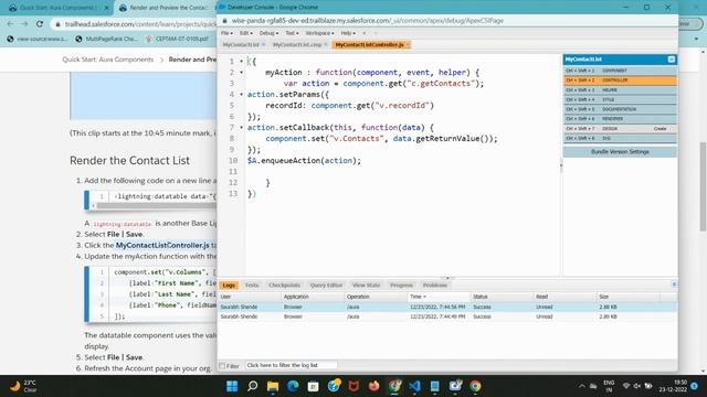 #salesforce #trailhead #salestraining #salesforcetrailhead Quick Start: Aura Components Add the following code on a new line after the comment A lightning:datatable is another Base Lightning Component that will display the list of contacts. Select File | Save. Click the MyContactListController.js tab. Update the myAction function with the following code on a new line above the var actionline: component.set("v.Columns", [ {label:"First Name", fieldName:"FirstName", type:"text"}, {label:"Last Name", fieldName:"LastName", type:"text"}, {label:"Phone", fieldName:"Phone", type:"phone"} ]); The datatable component uses the values stored in the Columns attribute to determine the number of columns to display. Select File | Save. Refresh the Account page in your org. 00:00 Introduction 00:22 Coadding 02:37 Verify