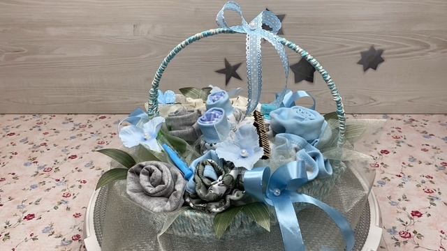 Подарочная корзинка с детской одеждой на выписку мальчика