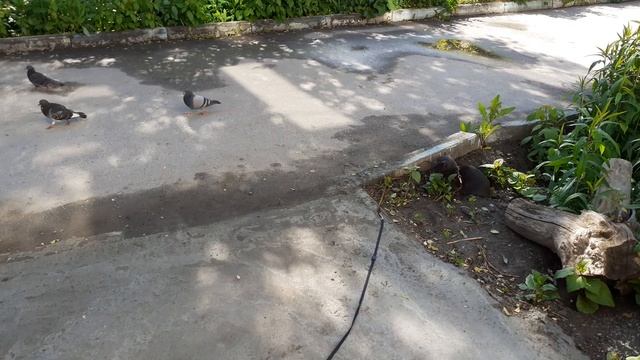 Котёнок Тишка охотиться на голубей, улица, прогулка.