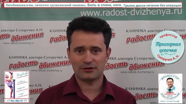 Лечение грыжи диска без операции. Люмбоишиалгия, симптом грушевидной мышцы. Боль в спине, ноге. Сухоручко А.Н. Методика Триггерная цепочка. Почувствуй легкость, энергию, силу — без мигрени, грыжи диска, остеохондроза, невралгий, артроза, сколиоза, панической атаки! Освободись от мифов неврологии, нейрохирургии, ортопедии, остеопатии; мануальной, висцеральной, кранио-сакральной, кинезиотерапий! Владей новой информацией и будь здоров! Сухоручко А.Н. Методика «Триггерная цепочка». Подробней читать в книге А.Н. Сухоручко "Триггерная цепочка. Энциклопедия здоровья позвоночника и суставов" / https://сухоручко.рф/
