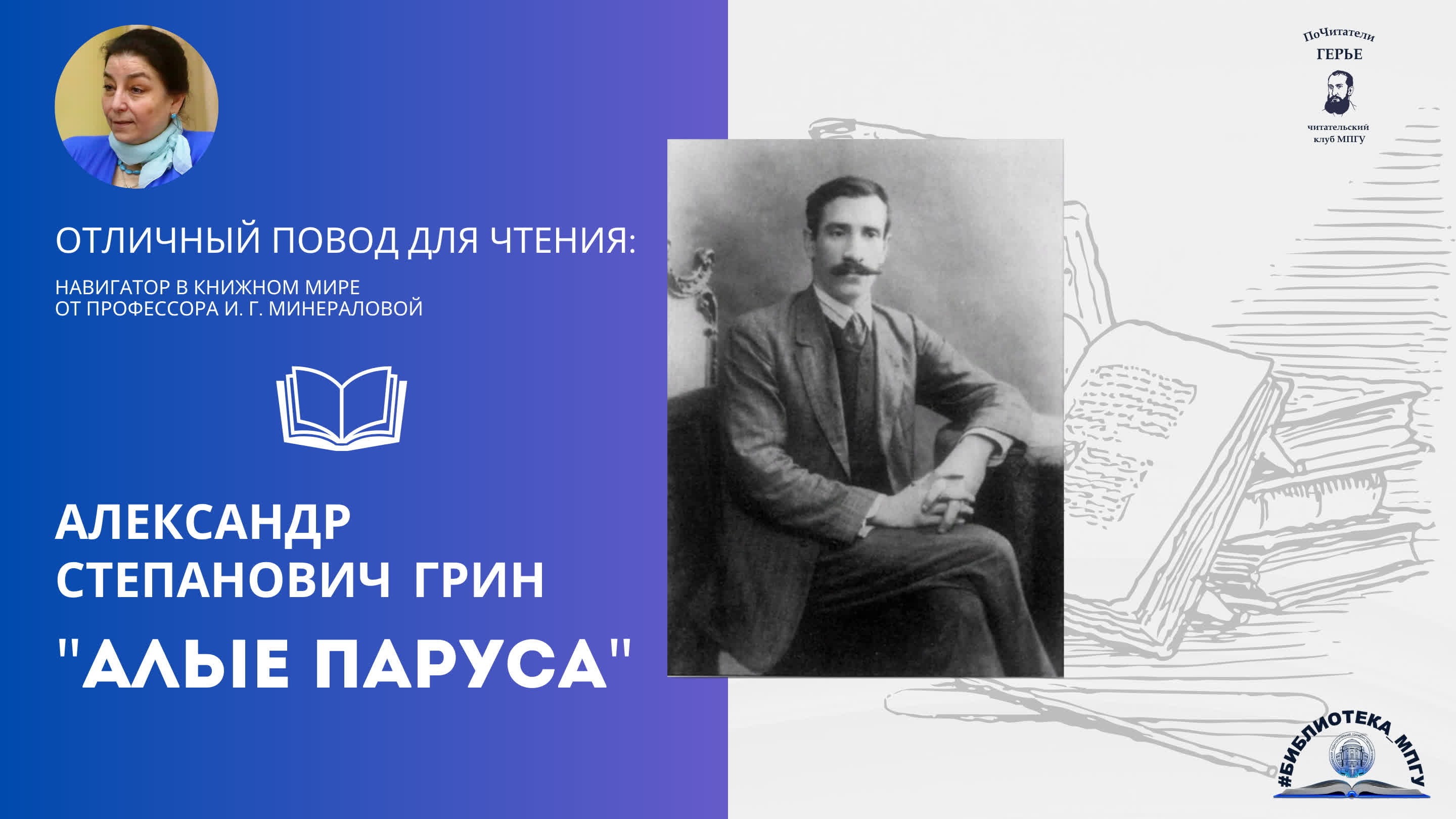 Библиотека МПГУ представляет проект "Отличный повод для чтения: навигатор в книжном мире от профессора И. Г. Минераловой". О повести-феерии Александра Грина «Алые паруса» рассказывает профессор Кафедры русской литературы XX-XXI веков Института филологии МПГУ, доктор филологических наук Минералова Ирина Георгиевна. Создатели проекта: авторы идеи – Минералова И. Г., профессор Кафедры русской литературы XX-XXI веков Института филологии МПГУ, доктор филологических наук, Лиханова И. В., директор библиотеки МПГУ, Свирина М. Н., заведующий информационно-справочной службой библиотеки МПГУ; подготовка материалов – Самородов Б. А., библиограф; текст за кадром, монтаж – Климова А. А., главный библиотекарь. Авторы использованных иллюстраций: С. Бродский, А. Харшак, М. Дорохов, В. Высоцкий, В. Власов, В. Козлинский, Л. Эппле, Н. Алешина, Л. Бычков, Л. Фейнберг, А. Хрящевский, Л. Ерастова. Вопросы о доступности изданий из фонда Библиотеки МПГУ Вы можете направить на почту: lib_ms@mpgu.su . Адреса отделов Библиотеки МПГУ Вы можете посмотреть, перейдя по ссылке: http://mpgu.su/ob-mpgu/struktura/bibl... . #МПГУ #Минералова #Книги #Грин