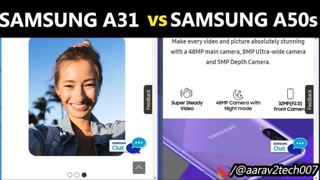 "Namaskar, es video me Samsung Galaxy A31 vs Samsung Galaxy A50s ke baare me baat ki hai.umeed hai Galaxy A31 vs Galaxy A50s ki ye video aapko pansad aayaga.video ko like & share karte rahiye. Samsung Galaxy A31 vs Samsung Galaxy A51: https://youtu.be/vEZbsdhu26Y Subscribe: https://goo.gl/Lvjecf Query Solved: 1.Samsung Galaxy A31 aur Samsung Galaxy A50s 2.Galaxy A31 vs Galaxy A50s 3.Samsung A31 vs Samsung A50s 4.A31 vs A50s 5.Samsung A31 vs A50s Samsung Galaxy A31: 6GB + 128GB = 21,999/- Samsung Galaxy A50s: 4GB + 128GB = 18,599/- 6GB + 128GB = 20,561/- (Any Question For Comment Box Fill.) ..................................Daily Video Uplaod Jai Hind Follow Kar Sakte Ho:- Youtube: https://www.youtube.com/c/Aarav2Tech Twitter: https://www.twitter.com/aarav2tech3 Facebook: https://www.facebook.com/aarav2tech007 Instagram: https://www.instagram.com/aarav2tech007 Thanks #Aarav2Tech LIKE | COMMENT | SHARE | SUBSCRIBE
