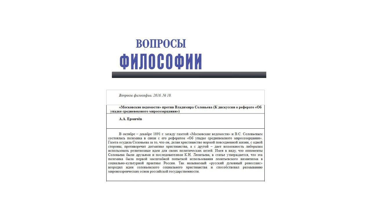 Семинар «Русская мысль» в РХГА Представляет доклад д.филос.н., профессора РХГА Александра Александровича Ермичёва «"Московские ведомости" против Владимира Соловьева. Полемика "О кризисе средневекового миросозерцания" – октябрь 1891-январь 1892 г.» (в рамках ежегодных Свято-Троицких Чтений в РХГА). 25 мая 2016 г.
