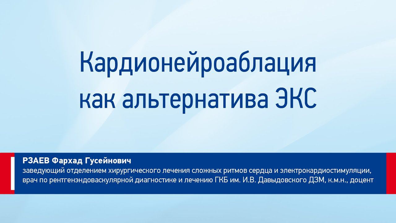Московская школа кардиологов. Инвазивная кардиология Инвазивная аритмология Кардионейроаблация как альтернатива ЭКС Рзаев Фархад Гусейнович заведующий отделением хирургического лечения сложных ритмов сердца и электрокардиостимуляции, врач по рентгенэндоваскулярной диагностике и лечению