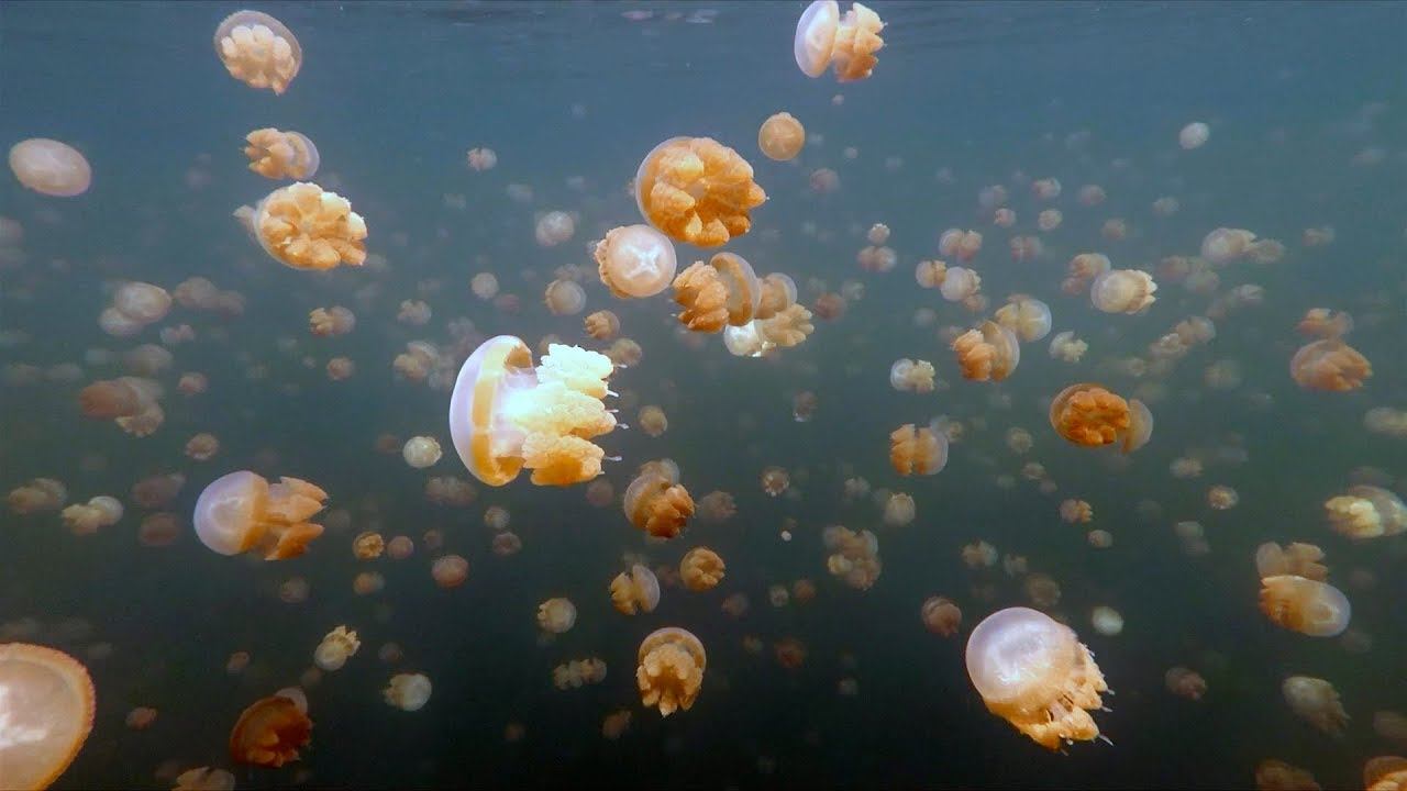 Wanna watch new videos first? Please, support me on Patreon - https://www.patreon.com/Ad0a0m In Indonesia there is some islands with lakes, some of them are very popular, some not explored yet, where thousands of jellyfish live, making it interesting for diving. One of them is Kakaban island in Derawan archipelago, East Kalimantan. It has biggest stingless jellyfish lake in the world. Here the jellyfish consist of four different species which do not have the ability to harm humans with their stinging cells. They are Aurelia aurita with a transparent body, Tripedalia cystophora which is fingertip size, Mastigias papua is like a green-brown bulb, and Cassiopea ornata which is an upside-down jellyfish with upright tentacles. Although they cannot sting humans, they still have poison and can sting their prey. Similar lakes exist in other parts of Indonesia - for instance, Raja Ampat, Misool. The lakes have warm brackish water and the bottom is covered with marine green algae. There are other animals, including sea cucumbers, gobies, sea anemones, tunicates, crustaceans, nudibranchs, orange purple clams and yellow clams on the branches, and snakes. Read more - https://forum.awd.ru/viewtopic.php?f=239&t=336151&start=240#p9246435