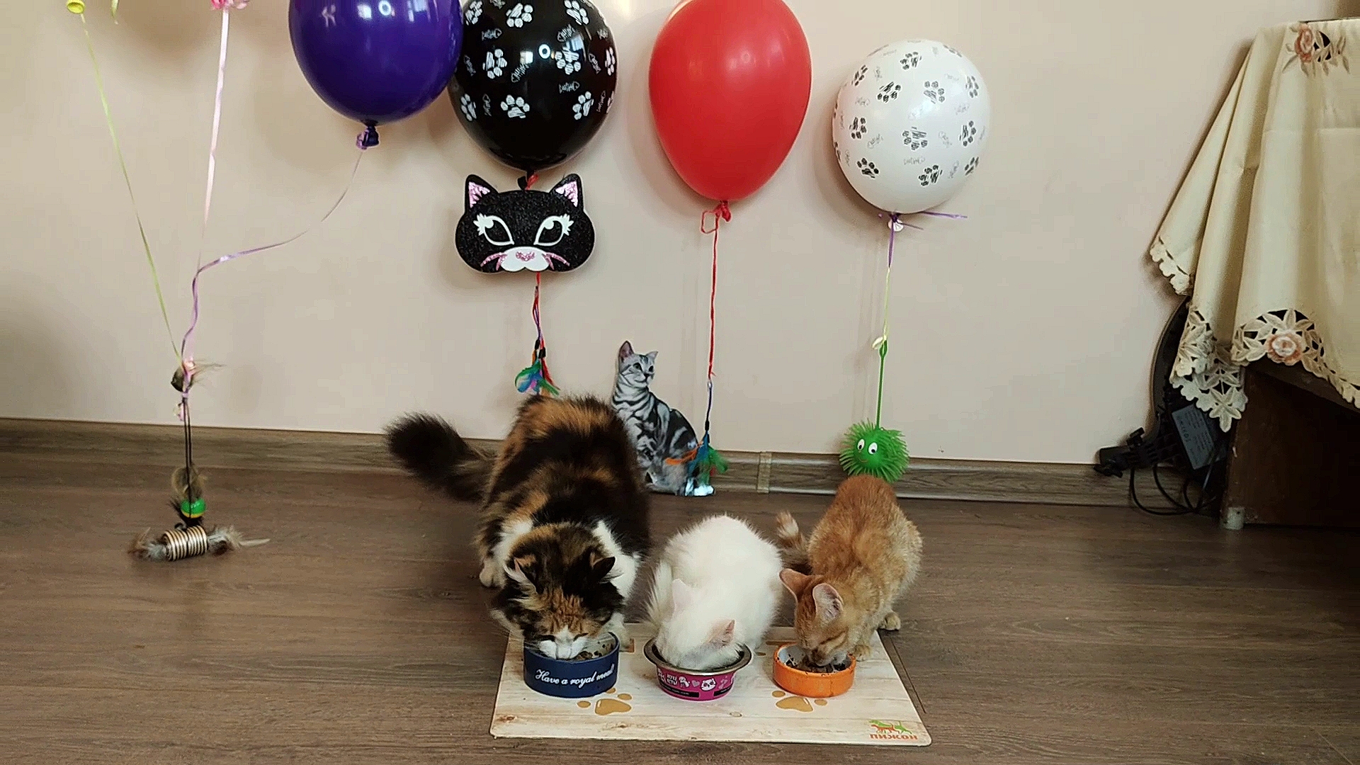 Три кота едят возле надуваемых воздушных шаров.