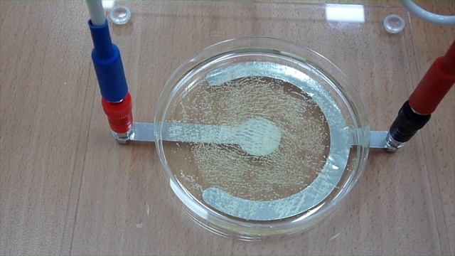 Посмотрим, как сильное электростатическое поле действует на частицы манной крупы в касторовом масле.
