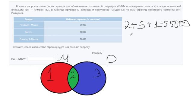 http://egoroffartem.pythonanywhere.com/oge/task/18 На сайте размещены другие задания по этой теме http://egoroffartem.pythonanywhere.com/oge/videotask/18 Список всех разборов 18 задания из ОГЭ по информатике: https://www.egoroffartem.ru/oge/videotask/ Видео решения задач по ОГЭ информатике https://vk.com/egoroff_channel_oge В данном группе можете найти информацию о новых видео и задать вопросы по ОГЭ Информатике Разбор задания № 18 ОГЭ ИНФОРМАТИКА Тема задачи "Поисковые запросы в Интернете" В языке запросов поискового сервера для обозначения логической операции «ИЛИ» используется символ «|», а для логической операции «И» — символ «&». В таблице приведены запросы и количество найденных по ним страниц некоторого сегмента сети Интернет. Запрос Найдено страниц (в тысячах) Роналду | Месси 55000 Месси 40000 Роналду & Месси 16000 Укажите, какое количество страниц будет найдено по запросу: Роналду Считается, что все запросы выполнялись практически одновременно, так что набор страниц, содержащих все искомые слова, не изменялся за время выполнения запросов.