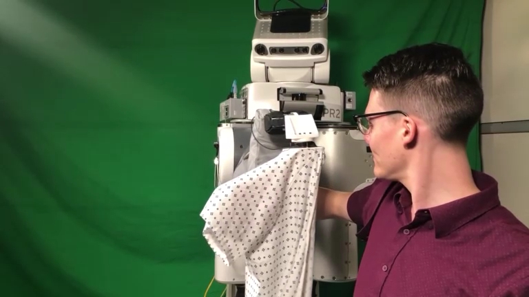 Инженеры Технологического института Джорджии создали робота, который при помощи искусственного интеллекта научился накидывать на человека больничную робу. Для этого машине не нужны камеры — она ориентируется на силу натяжения ткани. Кодовое название автомата — PR2. По замыслу создателей, однажды он поступит на службу в больницы и хосписы для помощи пациентам, но сейчас робот только учится. Чтобы ускорить процесс обучения, специалисты смоделировали 11 тысяч виртуальных примеров того, как ИИ натягивает халат. Среди них — безошибочные движения и грубые ошибки. Основываясь на этих образцах, алгоритм научился соизмерять силу во время процедуры.