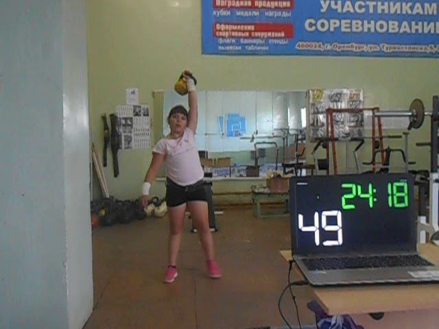 Гиревой спорт. Полумарафон Белякова Арина 2011 года рождения толчок одной гири 6 кг по Длин. Циклу 30 минут 24.08.2020 года. Результат 150 подъёмов.
