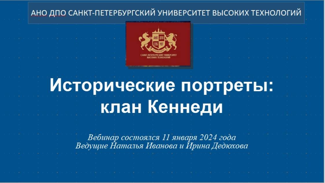 Исторические портреты: клан Кеннеди (2024) Первый вебинар Книжной лавки на эту тему состоялся 11.01.2024 г. Видео материал к вебинару, вырезан из ролика из-за ограничения по времени - https://e.mail.ru/inbox/0:17569931461087895594:0/ Ведущие Наталья Иванова и Ирина Дедюхова Смотреть/читать по теме: Исторические портреты: клан Кеннеди https://ogurcova-portal.com/istoricheskie-portrety-klan-kennedi/ (2020/2024) Первый вебинар 2020 года - https://rutube.ru/video/56d017787ba8ae1f1150fd8c65b49960/ Источники: Научно-технический портал «Технарь» https://ogurcova-online.com/ "Книжная лавка" https://ogurcova-portal.com/ "Литературное обозрение" https://litobozrenie.com/ Вебинар разработан и проведен в рамках образовательных программ АНО ДПО СПБ УВТ - Санкт-Петербургский университет высоких технологий https://univer.spb.ru/ в соответствии с законодательством об образовательной деятельности в РФ N 273-ФЗ по лицензии №3911 Комитета по образованию Правительства СПб https://univer.spb.ru/wp-content/uploads/2019/12/license015small-1.jpg
