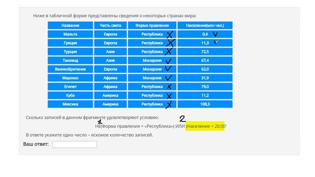 https://www.egoroffartem.ru/oge/task/12 На сайте размещены другие задания по этой теме https://www.egoroffartem.ru/oge/videotask/12 Список всех разборов 12 задания из ОГЭ по информатике: https://www.egoroffartem.ru/oge/videotask/ Видео решения задач по ОГЭ информатике https://vk.com/egoroff_channel_oge В данном группе можете найти информацию о новых видео и задать вопросы по ОГЭ Информатике Разбор задания № 12 ОГЭ ИНФОРМАТИКА Тема задачи "Базы данных. Проверка условия" Ниже в табличной форме представлены сведения о некоторых странах мира: Сколько записей в данном фрагменте удовлетворяют условию: НЕ(Форма правления = «Республика») ИЛИ (Население меньше 20,0)? В ответе укажите одно число – искомое количество записей.