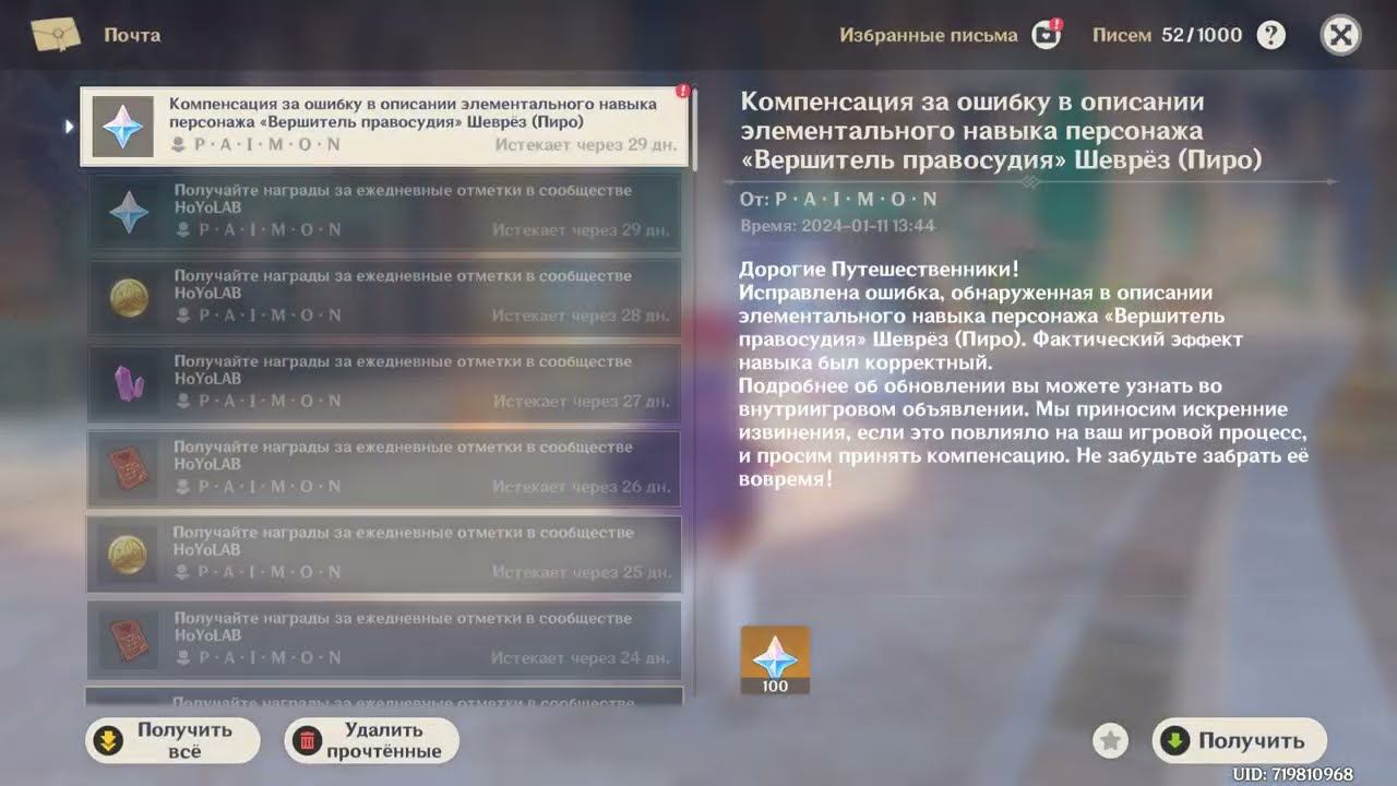 Genshin Impact/Компенсация 100 примогемов за неправильное описание скилла Шеврёз УЖЕ НА ПОЧТЕ
