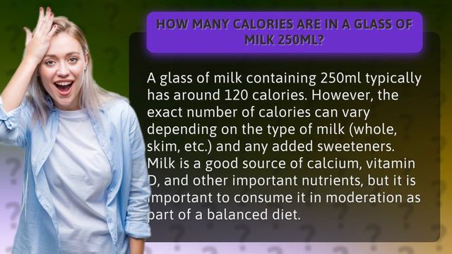 Curious about the calorie count in your favorite glass of milk? Look no further! In this informative video, we break down exactly how many calories are in a 250ml serving of milk. Discover how the type of milk and any added sweeteners can affect the calorie count, and learn why milk is an important part of a balanced diet. Don't miss out on this essential nutritional insight - hit play now!