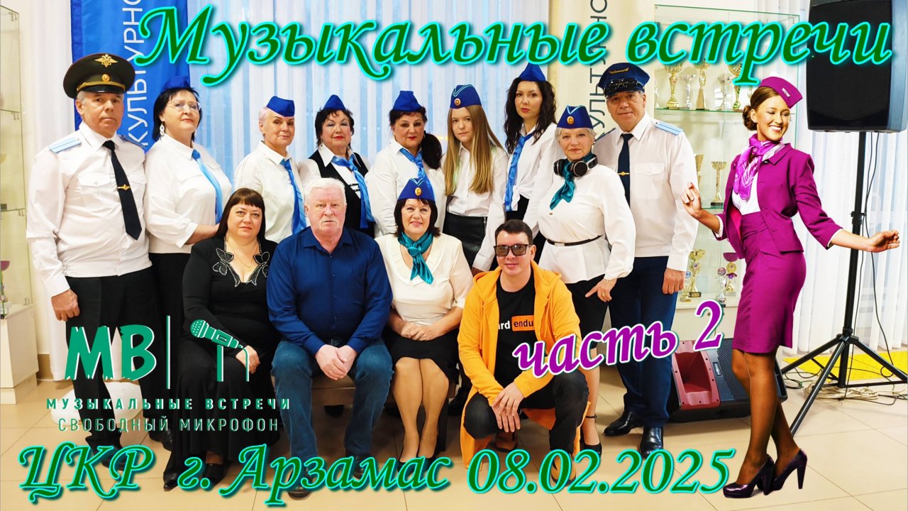 Музыкальные встречи 8 февраля 2025 г. в ЦКР г. Арзамас, часть 2 Концерт к Дню Гражданской Авиации В программе принимали участие: Арина Борисова Стас Наумов Светлана Колотовкина Евгений Воронин Светлана Синякова Игорь Самохвалов Елена Зуева Евгений Железнов Наталья Железнова Елена Грачёва Екатерина Самойленко Нинэль (Нина Родина) Звукорежиссер: Андрей Корчёмкин Видеооператоры: Лариса Наумова и Вера Князева
