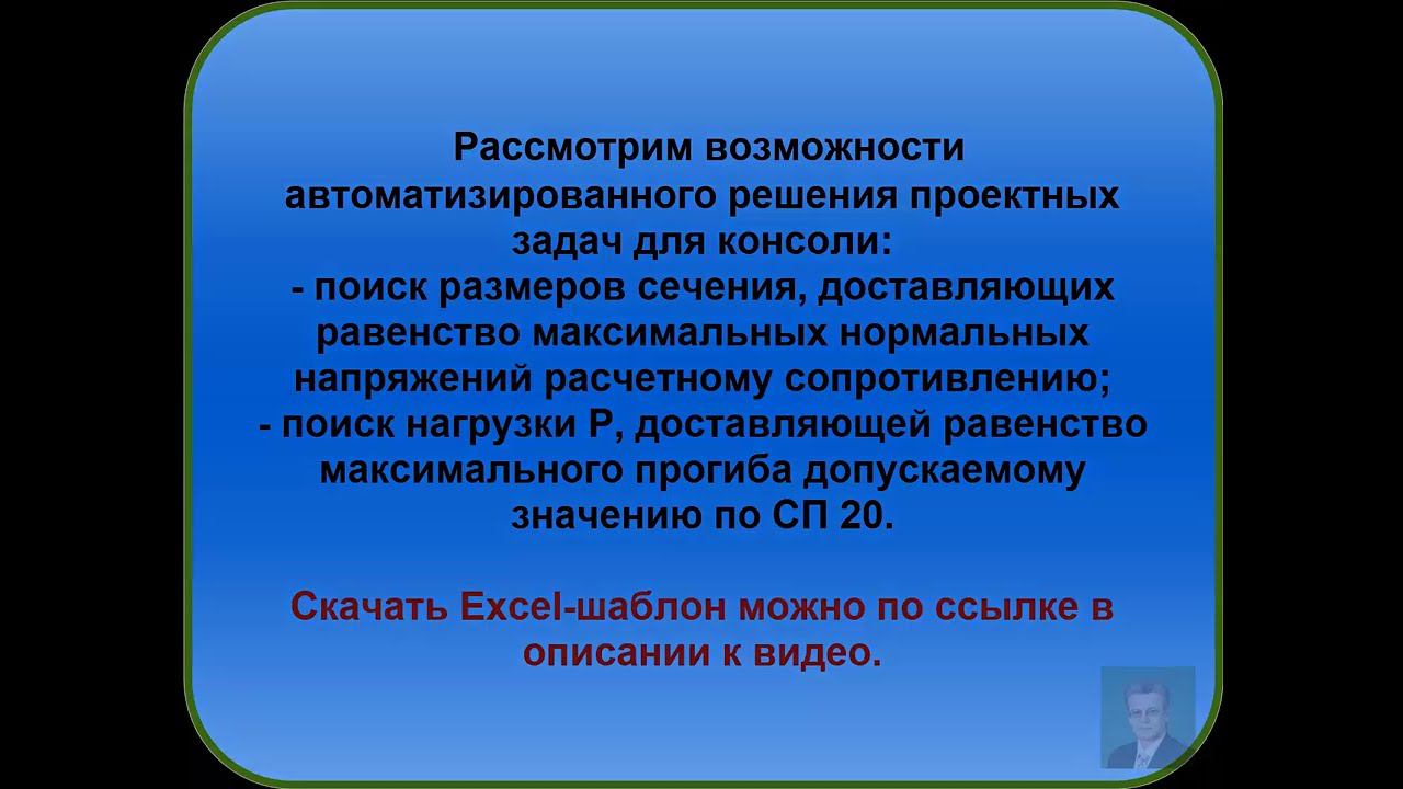 Онлайн университет проф. Макеева С.А. продолжает публикацию автоматизированных Excel-шаблонов расчета простых балок на прочность и жесткость. Сегодня рассмотрим консольную балку, загруженную на конце силой Р с решением частных проектных задач. Скачать рабочий Excel-шаблон «Консольная балка с загружением поперечной силой Р» можно по ссылке https://cloud.mail.ru/public/1MpG/vj3GneCJS. Рассмотрен Excel-шаблон, реализующий прямое численное интегрирование системы дифференциальных уравнений поперечного изгиба балок методом Эйлера. Шаблон позволяет в автоматизированном режиме выполнять проверочные и ПРОЕКТНЫЕ расчеты на прочность и жесткость консольной балки заданной длины L (мм) любого сечения, из любого материала, загруженной любой поперечной силой Р. Более полное знакомство с дифференциальными уравнениями напряженно-деформированного состояния балок при поперечном изгибе, граничными условиями, эпюрами поперечных сил Qy(z), изгибающих моментов Mx(z), углов поворота сечений φx(z) прогибов V(z) представлено в моих видео «Правильный сопромат» https://www.youtube.com/playlist?list=PLRg82kZ234fIBkjPXeAT2GhQkDlB0pdc3. Представленные здесь в свободном доступе материалы являются частью большого платного тренинга в трех частях «Поперечный изгиб стержней с прямой осью», где в автоматическом режиме можно решать ЛЮБЫЕ балки, вплоть до ленточных железобетонных фундаментов на естественном основании с подбором армирования, анализировать прочность и жесткость профлиста кровли по прогонам с учетом снегового мешка … https://shop.sopromex.ru/pich_1_2_3. Оформить подписку на все бесплатные материалы проф. Макеева С.А. по основам расчетов конструкций на прочность и жесткость для ПГС можно на главной странице сайта онлайн университета https://sopromex.ru/ или на отдельных страницах http://m1.sopromex.ru/, https://makeev.justclick.ru/podpiska_2020 - это более 30 часов видео тренингов с программными комплексами по сопромату и автоматизации расчетов строительных конструкций на прочность и жесткость которые будут приходить вам на почту дозировано в течении месяца.