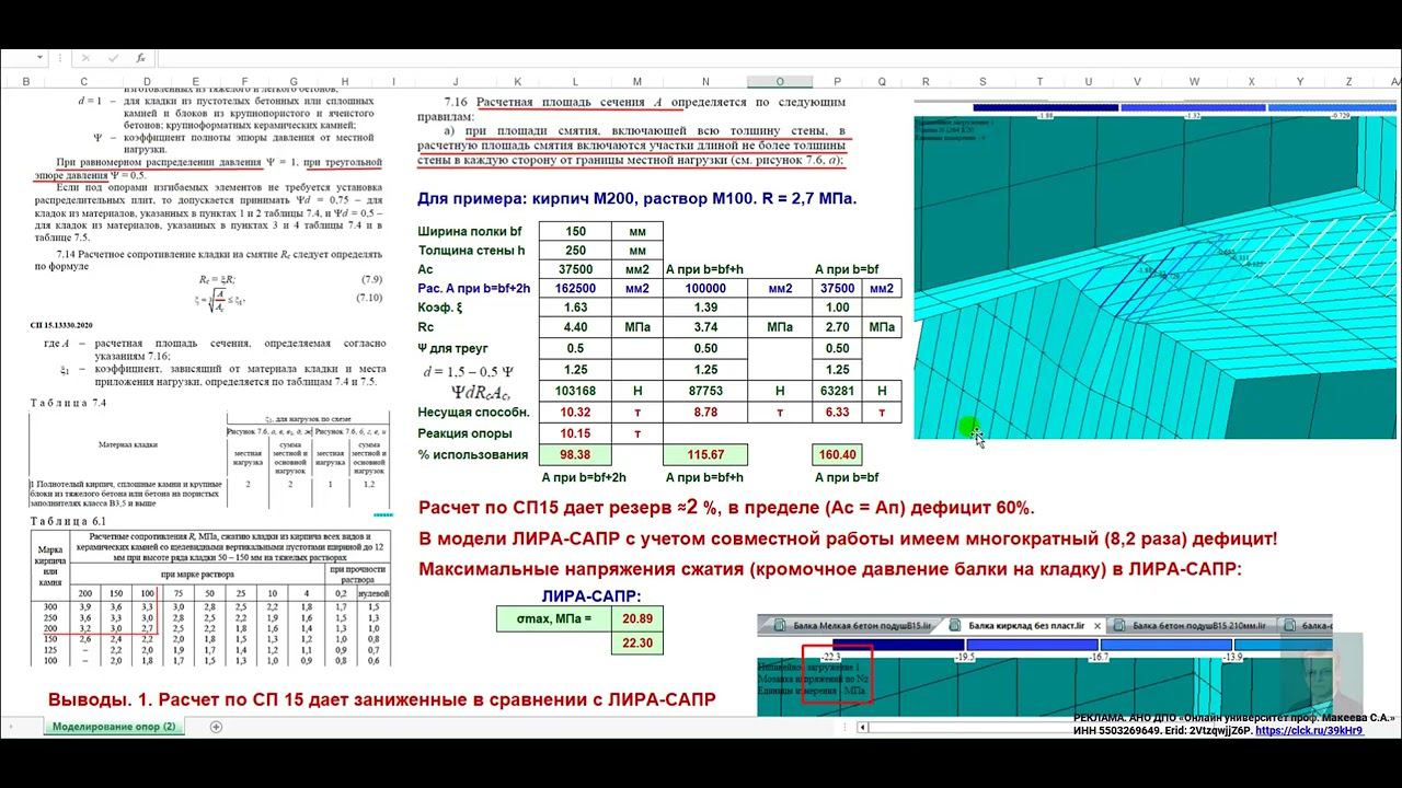 Переподготовка «ПГС: проектирование ЗиС (расчетно-конструктивный раздел)». Ссылка на страницу переподготовки https://makeev.justclick.ru/1pgs . Представлен краткий обзор (Видео 6.1) результатов расчетов НДС кирпичной кладки в опоре стальной балки по СП 15, п. 7.13 и при моделировании в ЛИРА-САПР с учетом совместной работы конструкций в створе КР по МК «Проектирование и расчет балочной клетки». Ссылка на ролик географии слушателей переподготовки https://youtu.be/o9JaBrjMTPw?si=Dk-zrdte2wGoAIl9 . Ссылка на ролик обзора образовательного портала Онлайн университета https://youtu.be/ZBewPiXsEss?si=CgcyWxYMp2JFW9KR . Ссылка на ролик «Обзор решение 3х задач ГХС стержней» https://youtu.be/yyQIvLi1gWE?si=S0so1AL9rMi8Z2zR. Ссылка на 30 роликов по темам переподготовки https://www.youtube.com/playlist?list=PLRg82kZ234fIcSxOKejYaWodGH6naPgSP. РЕКЛАМА. АНО ДПО «Онлайн университет проф. Макеева С.А.» ИНН 5503269649. Erid: 2VtzqwjjZ6P. https://clck.ru/39kHr9. Оформить подписку на все бесплатные видео материалы проф. Макеева С.А. можно на главной странице https://sopromex.ru/ либо на специальной странице https://makeev.justclick.ru/podpiska_2020 . В течение месяца каждый день вам на почту будут приходить структурированные видео материалы по основам расчетов конструкций на прочность и жесткость (не забыть подтвердить подписку на почте). Все платные тренинги проф. Макеева С.А. по основам расчетов конструкций на прочность и жёсткость (это 25 качественных видео материалов и авторских ПК) смотреть по ссылке https://disk.yandex.ru/i/xgHKw4irLRXe1A.