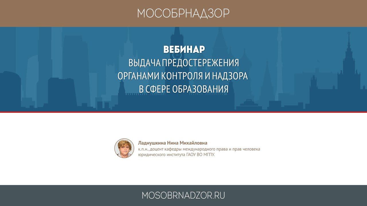 Вебинар «Выдача предостережения органами контроля и надзора в сфере образования» был проведен в рамках проекта Мособрнадзор.РФ 31 октября 2017 года. Ведущая вебинара - Ладнушкина Н.М. Страница вебинара на сайте проекта - http://mosobrnadzor.ru/supervision/webinars/2017-10-31_15-00