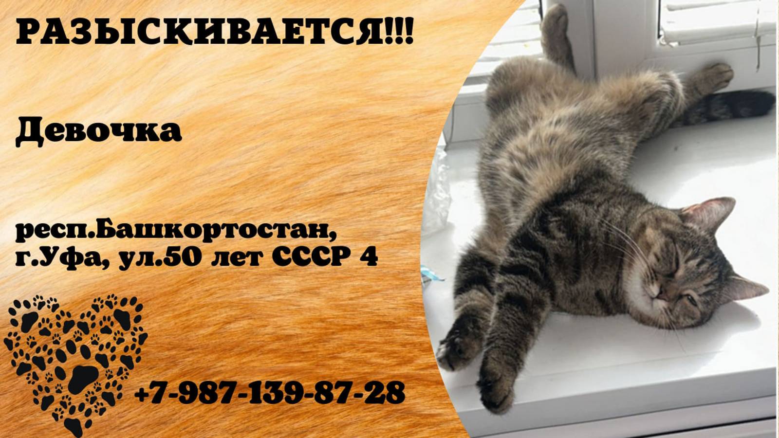Башкортостан Уфа Пропала кошка 14.10 Потерялась кошка по ул. 50 лет СССР 4. Прошу помощь найти! Если кто видел позвоните, пожалуйста. +7 987 139-87-28 Инфо: https://vk.com/wall-198815410_156791 Автор: https://vk.com/id249986785
