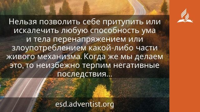Ибо вы куплены дорогою ценою. Посему прославляйте Бога и в телах ваших и в душах ваших, которые суть Божии (1 Кор. 6:20). Нужно учить воздержанию во всех сферах нашей жизни и воплощать его принципы на практике. Воздержание в еде, питье, сне и одежде является одним из главных принципов духовной жизни. Истина, проникшая во святилище души, поможет правильно обращаться с телом. На все, что касается здоровья человека, нельзя смотреть безразлично. Наше вечное благополучие зависит от того, как мы используем в этой жизни наше время, силы и влияние. Здесь нам дана только одна жизнь, и каждый должен спросить себя: как мне использовать мою жизнь с максимальной пользой? Наш первый долг перед Богом и ближними — саморазвитие. Каждую способность, которой Творец наделил нас, необходимо развить до наивысшей степени совершенства для того, чтобы мы могли творить как можно больше добра. И потому не зря потрачено время, направленное на достижение и сохранение крепкого умственного и физического здоровья. Нельзя позволить себе притупить или искалечить любую способность ума и тела перенапряжением или злоупотреблением какой-либо части живого механизма. Когда же мы делаем это, то неизбежно терпим негативные последствия… Каждый день люди, занимающие ответственное положение, должны принимать решения, от которых зависят последствия огромной важности. Часто им приходится быстро обдумывать решения, а на это способны только те, кто в своей жизни практикует строгое воздержание. Ум укрепляется при правильном использовании физических и умственных сил. Если напряжение не слишком велико, силы обновляются после каждой нагрузки… Кто, подобно Даниилу, не желает осквернять себя, те будут вознаграждены за воздержание, ставшее для них привычным. Обладая большей физической жизнеспособностью и выносливостью, воздержанные люди имеют в своем распоряжении запас сил, который выручит их в трудное время. Правильные физические привычки содействуют умственному прогрессу. Сила интеллекта, физическая сила и долголетие зависят от незыблемых законов. В этом деле не может быть случайности. Божья природа не станет спасать людей от нарушений законов природы (Воспитание детей. С. 394–396). https://esd.adventist.org/library/periodicals/ezhednevnyie-chteniya/ #адвентисты #АдвентистыСедьмогоДня #Церковь #ЦерковьАдвентистовСедьмогоДня #ЦерковьХристианАдвентистовСедьмогоДня