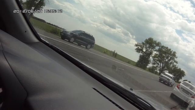 В Украине нас остановили сотрудники ДАI (ГИБДД). Я признал, что нарушил ПДД - занял не свою полосу при пересечении перекрестка. Мне вменяли пересечение сплошной. Я попросил составить протокол о правонарушении. Сотрудник попросил дать ему документы в руки. Я, руководствуясь Законом от 05.07.2011 N 3565-VI "О внесении изменений в некоторые законодательные акты Украины для устранения чрезмерного государственного регулирования в сфере автомобильных перевозок". (вступил в силу в середине августа 2011 года), отказал ему в этом. На что получил обвинение в подделке своих документов. После этого регистратор был опять включен. Продолжение на видео. Парень впереди тоже быстро "отделался" - сел к ним в машину и вскоре вышел. Кормить украинских гайцов мне лично не хотелось. Думаю, что если бы дал им документы в руки, то пришлось бы проследовать с ними до ближайшего отделения банка для срочной оплаты квитанции. На это времени тоже не было. Кроме всего, сотрудник не представился, жетон был скрыт накидкой. Т.е., запас тем для общения еще был... Через обещанных 2,5 км. увидели искорёженный авто, который грузили на эвакуатор... Снято на видеорегистратор mystery mdr-800hd