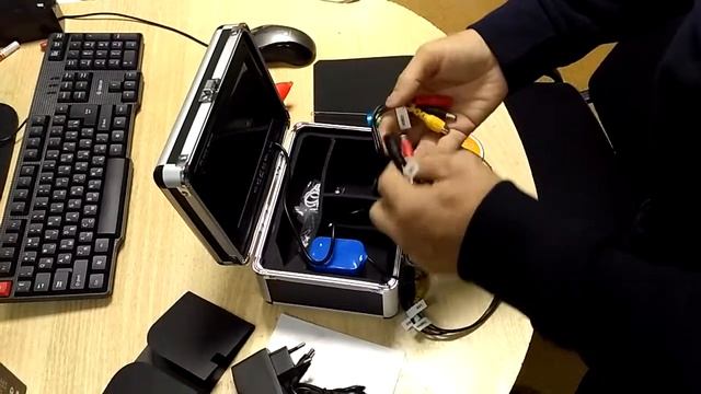 Подводная камера в кейсе с 7" дисплеем. Длина провода 15 метров, подсветка ИК. Смотреть на сайте поставщика https://avttech.ru/catalog/tovary_dlya_aktivnogo_otdyha/podvodnye_kamery/videokamera-dlya-rybalki-avt-997l/